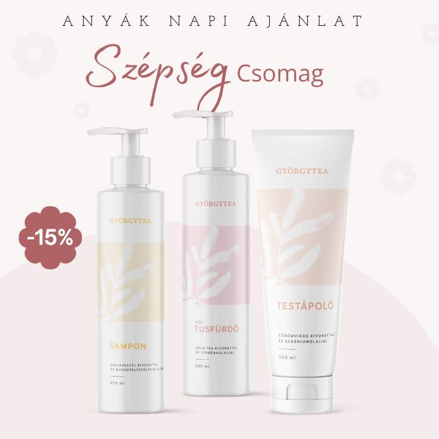 A Szépség csomag tartalma: Testápoló körömvirág kivonattal és gerániumolajjal, Női tusfürdő zöldtea kivonattal és verbénaolajjal, Sampon csalánlevél kivonattal és muskotályzsálya olajjal